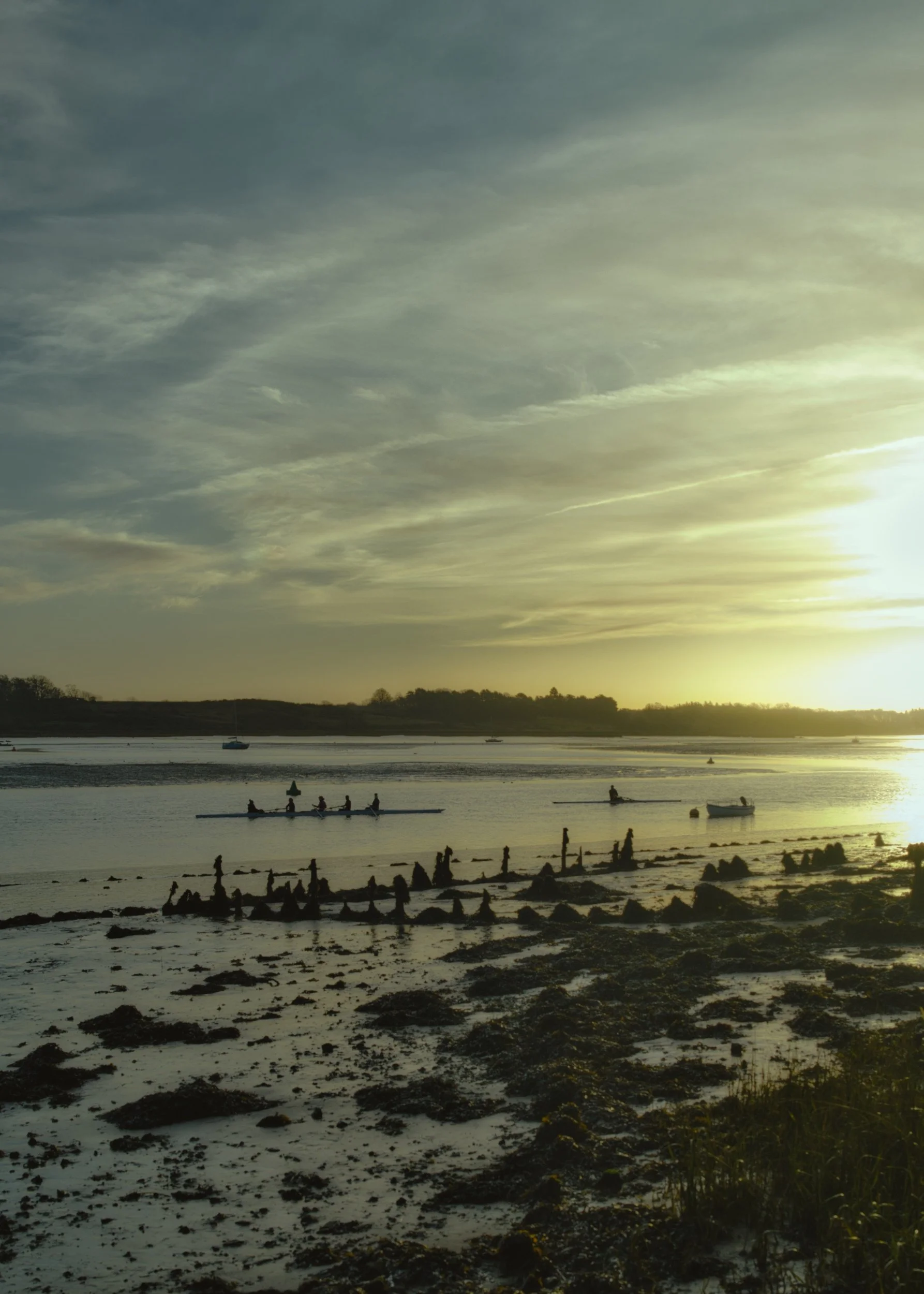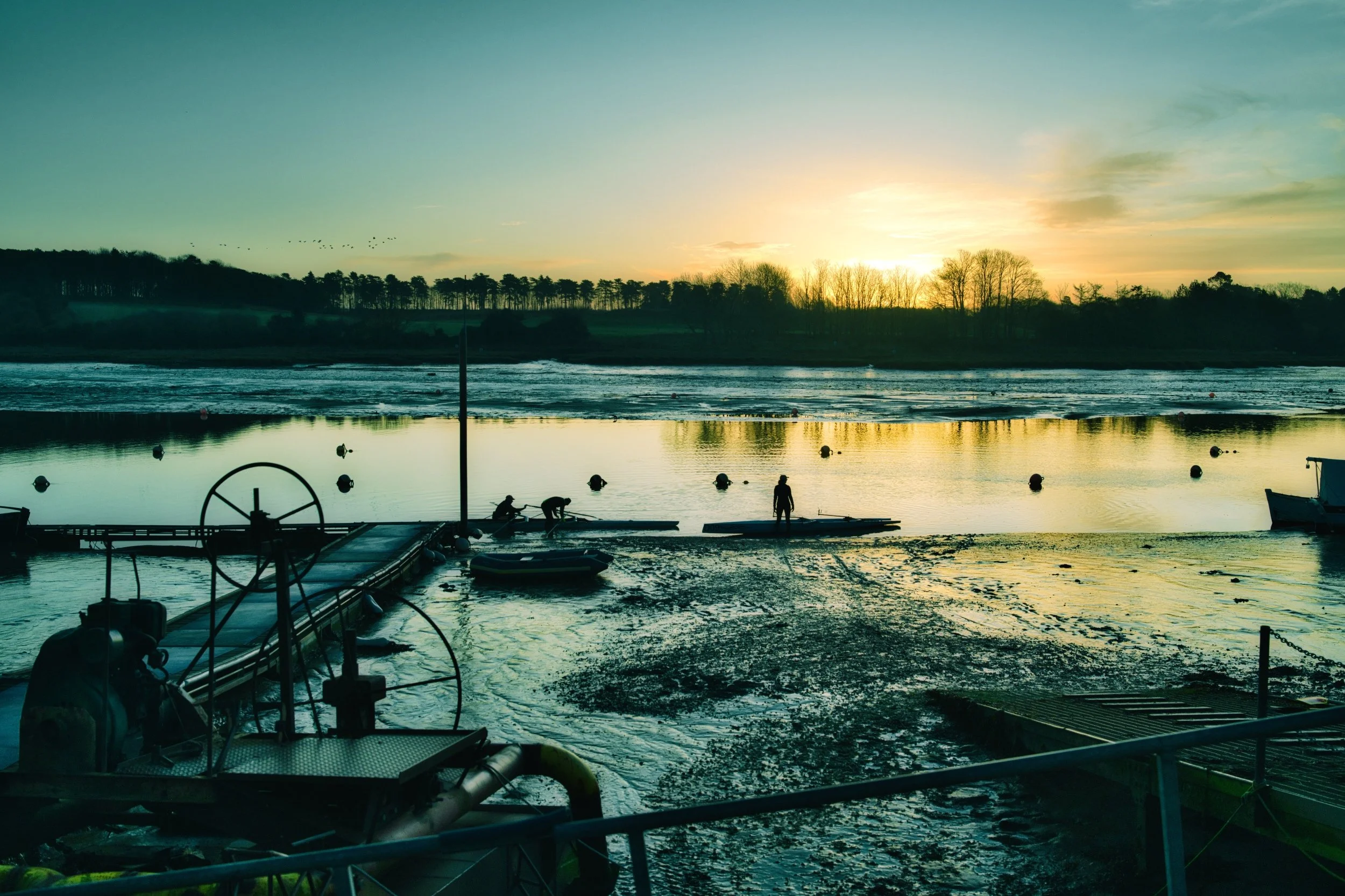 Rowers prepare to set out on a crisp winter morning. River Deben. Woodbridge.