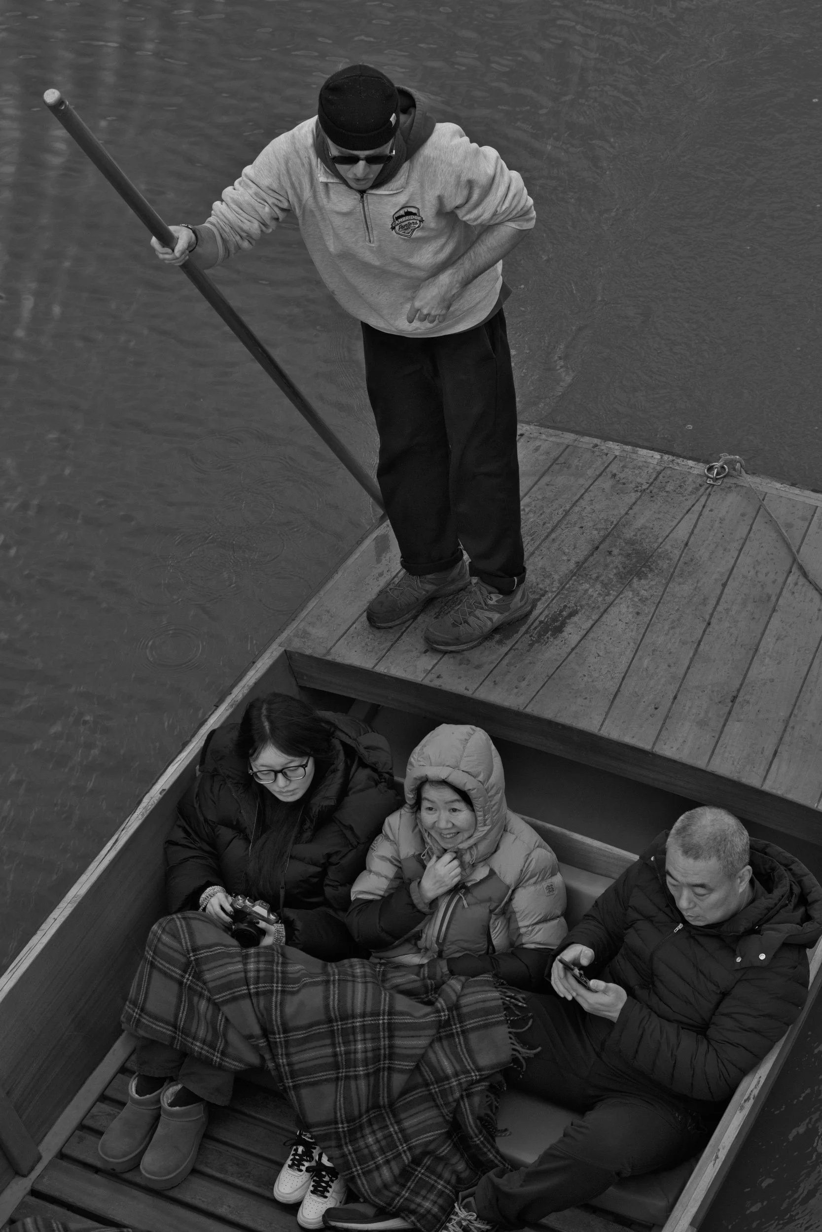 These tourists were taking a trip down the river Cam. The lady in the middle seems delighted.