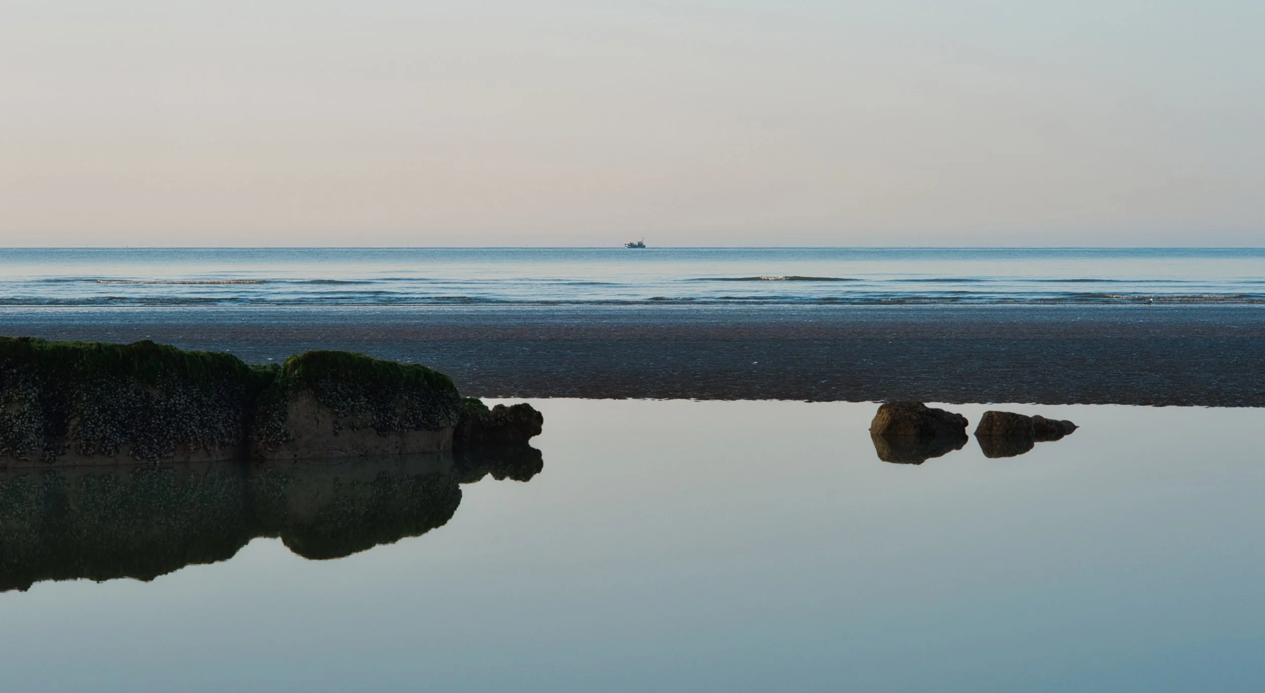 On a very still morning at low tide, the lagoons become mirror-like. A fishing boat balances precariously on the horizon.