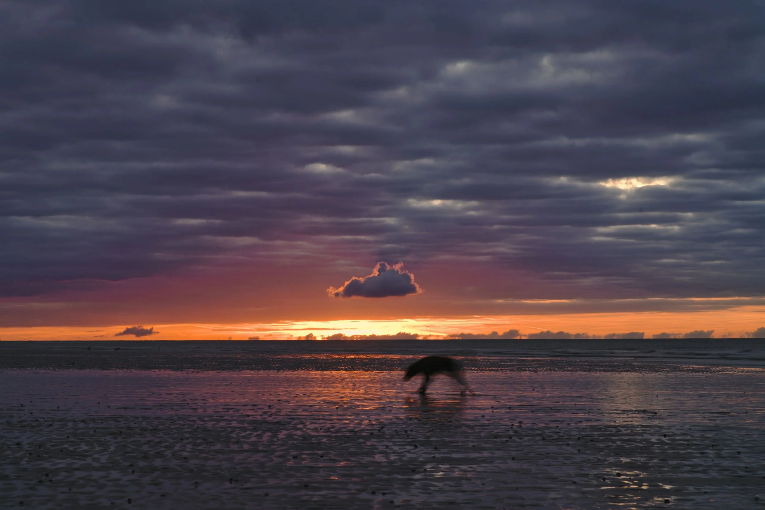 An isolated cloud is illuminated by the sunrise as a dog ambles by in a blur.