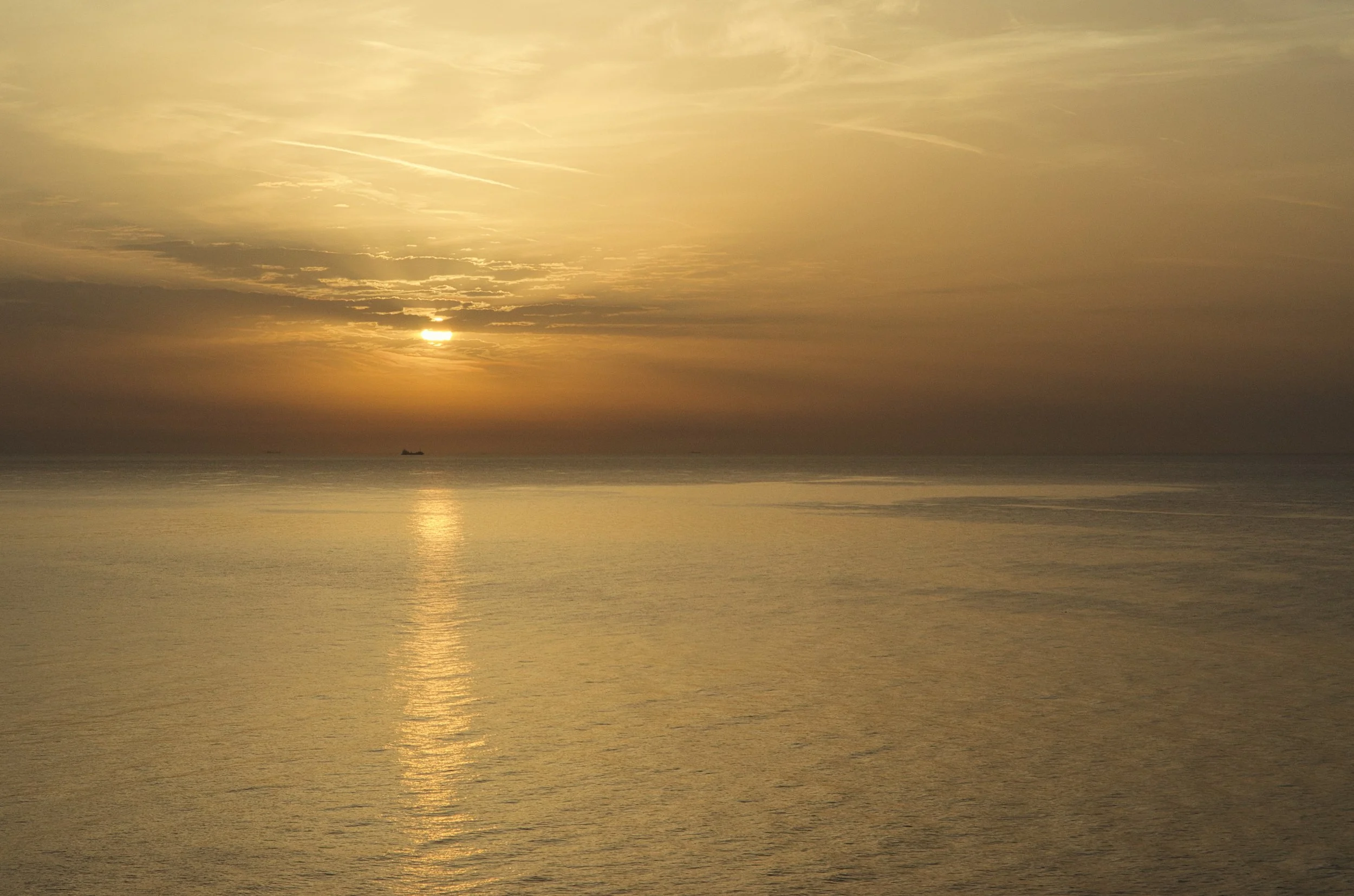 Picture taken from my balcony. An autumn sun illuminates the calm waters of the shipping lane.