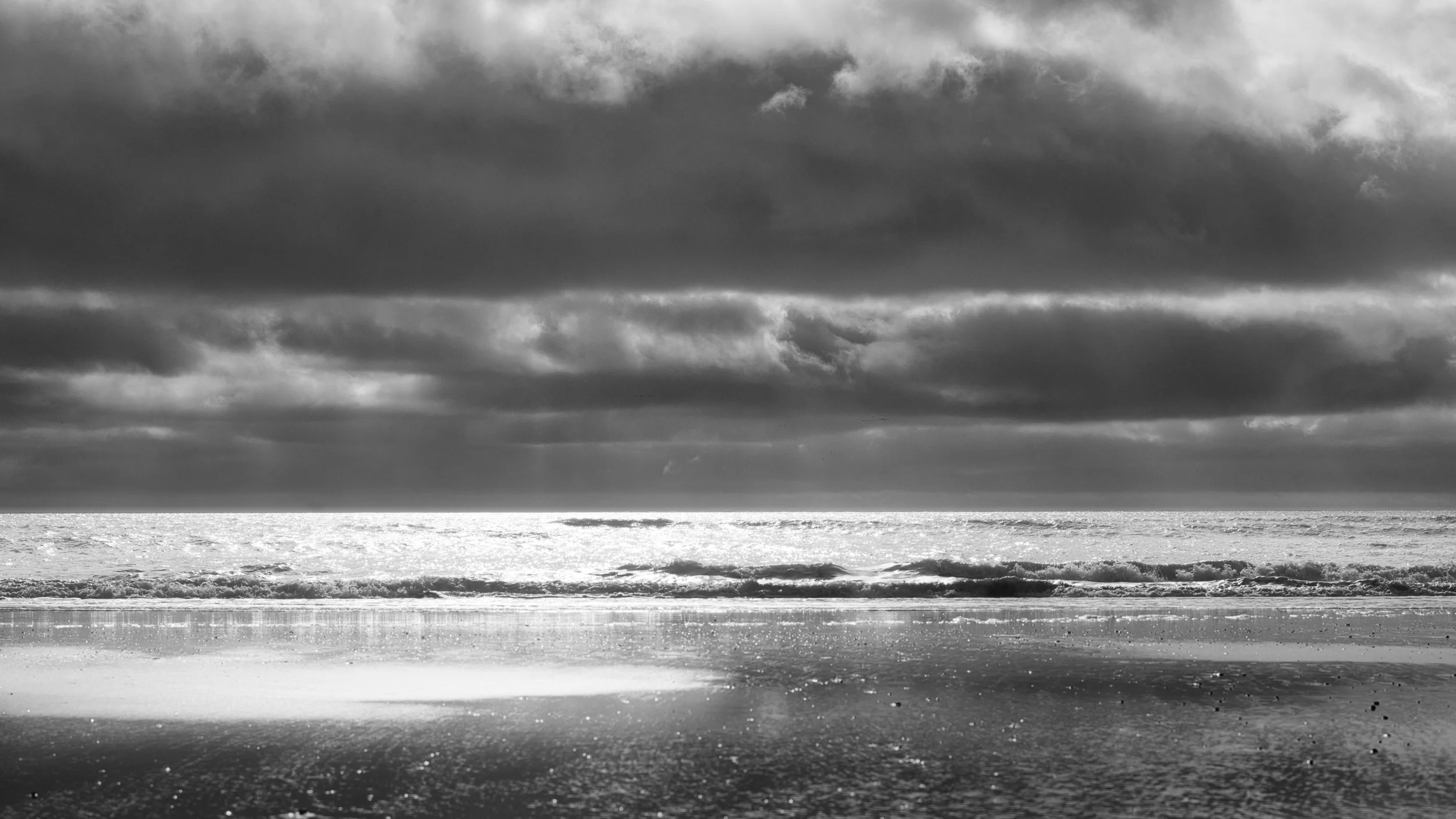 Heavy, stormy clouds dominated this winter day. Some rays of sun managed to break through, illuminating the sea and sand.