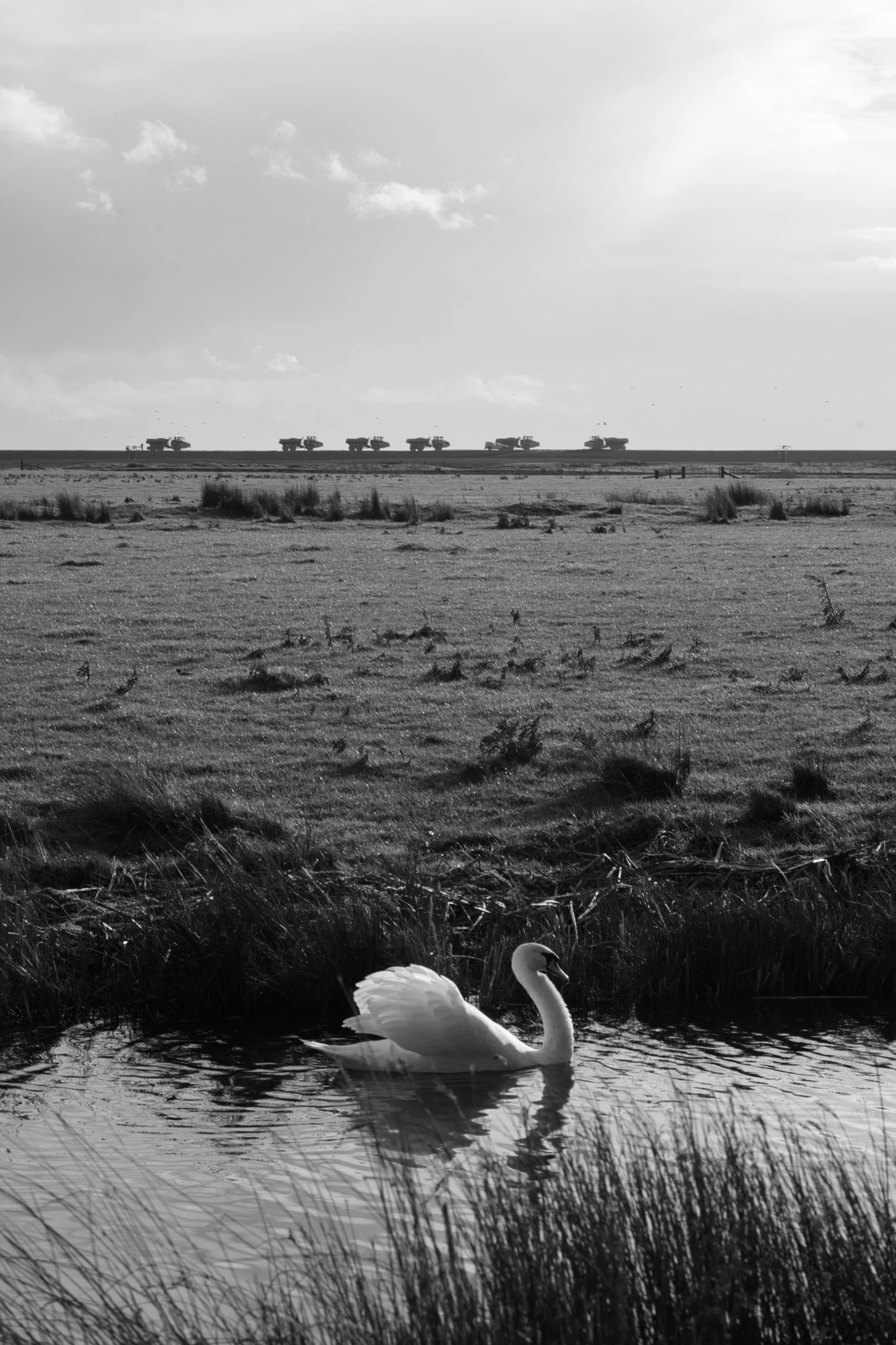 A swan cruises by as vehicles toil in the background, redistributing pebbles and shingle.