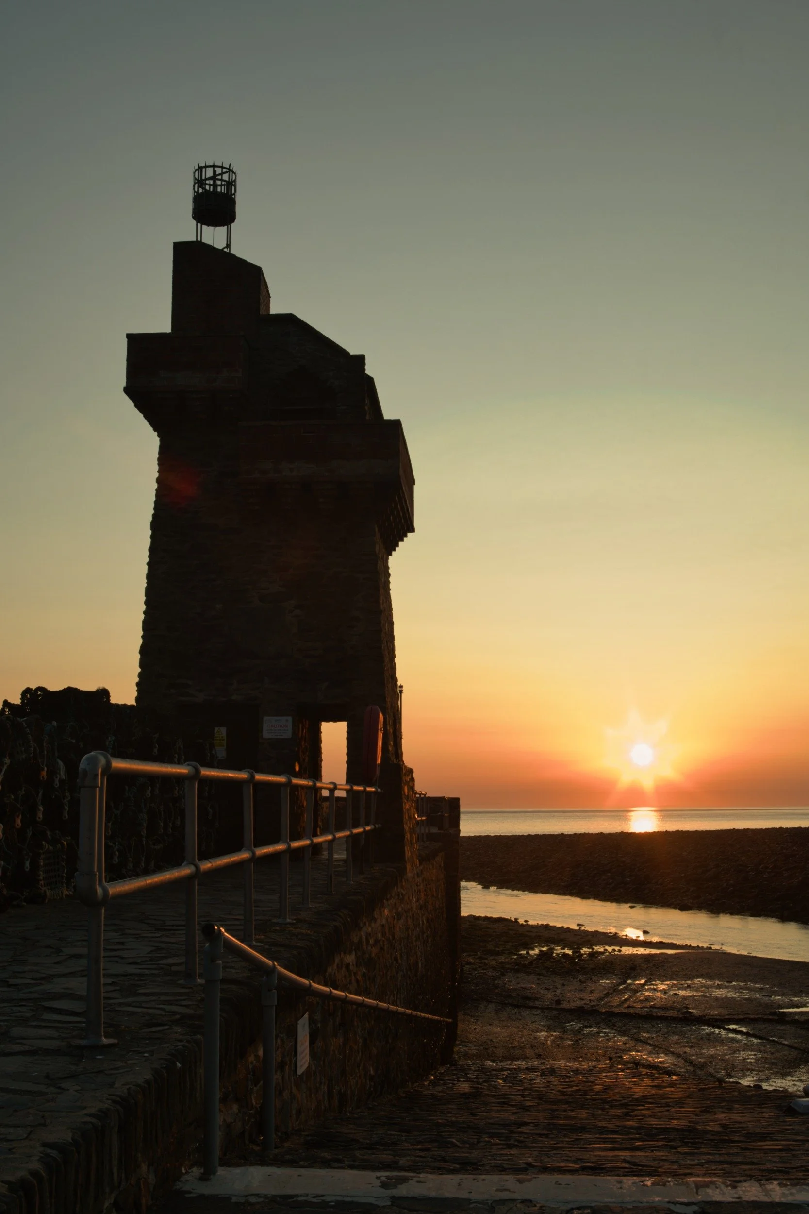 A beacon on Lynmouth Harbour tower is silhouetted in the sunrise.