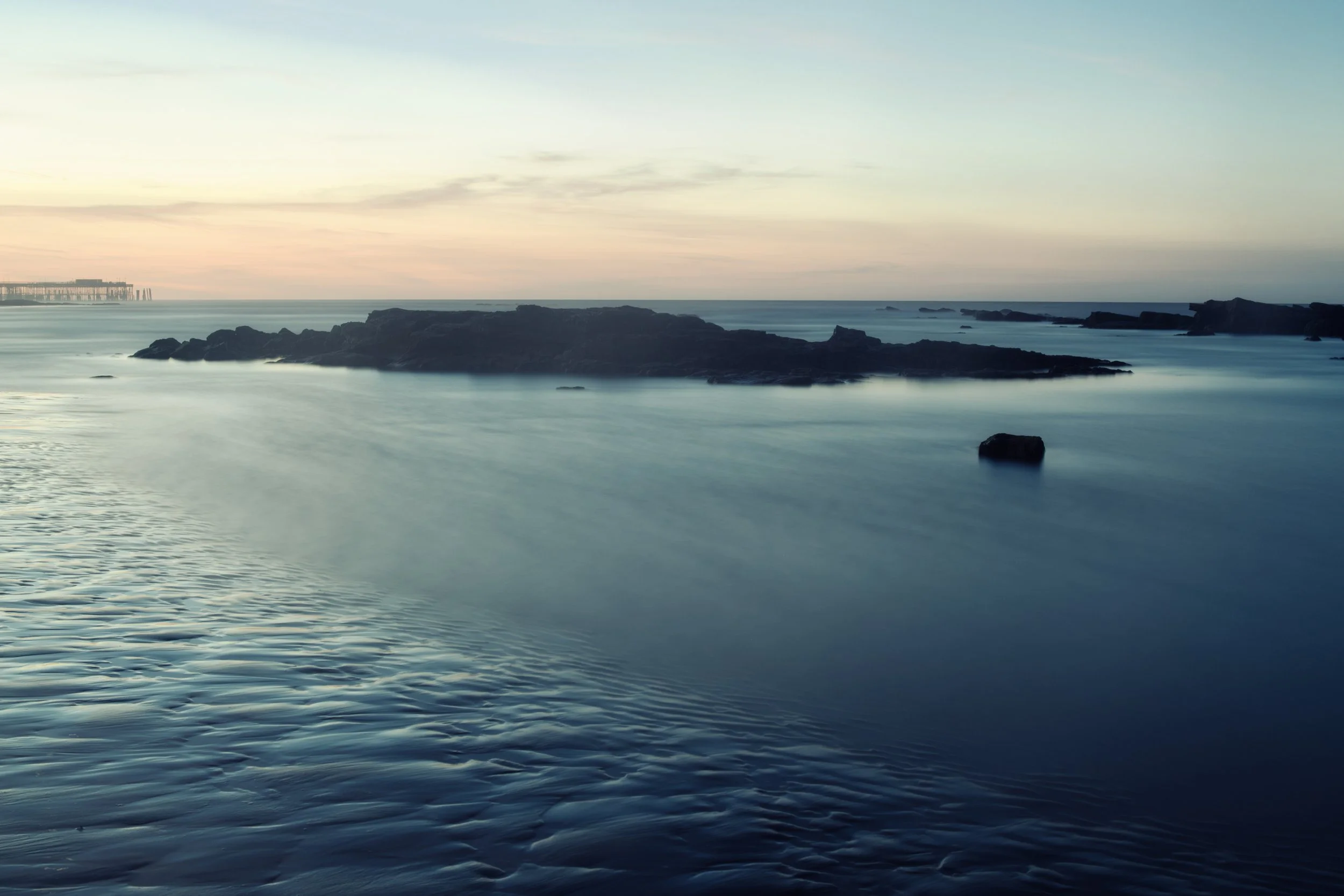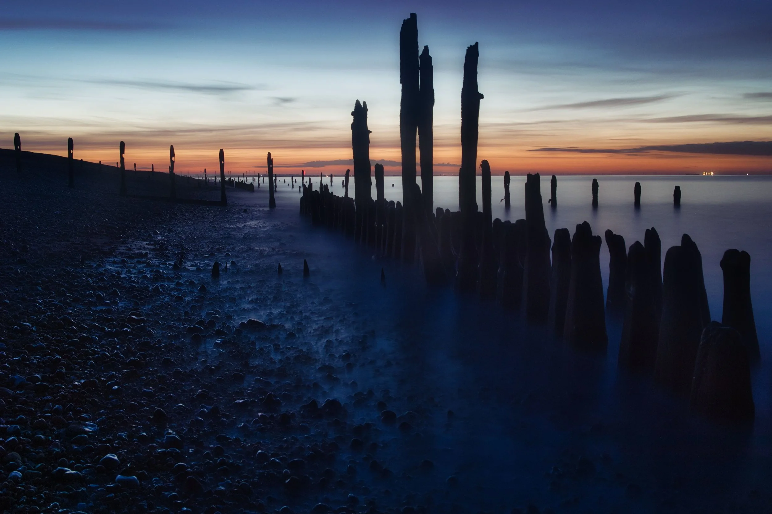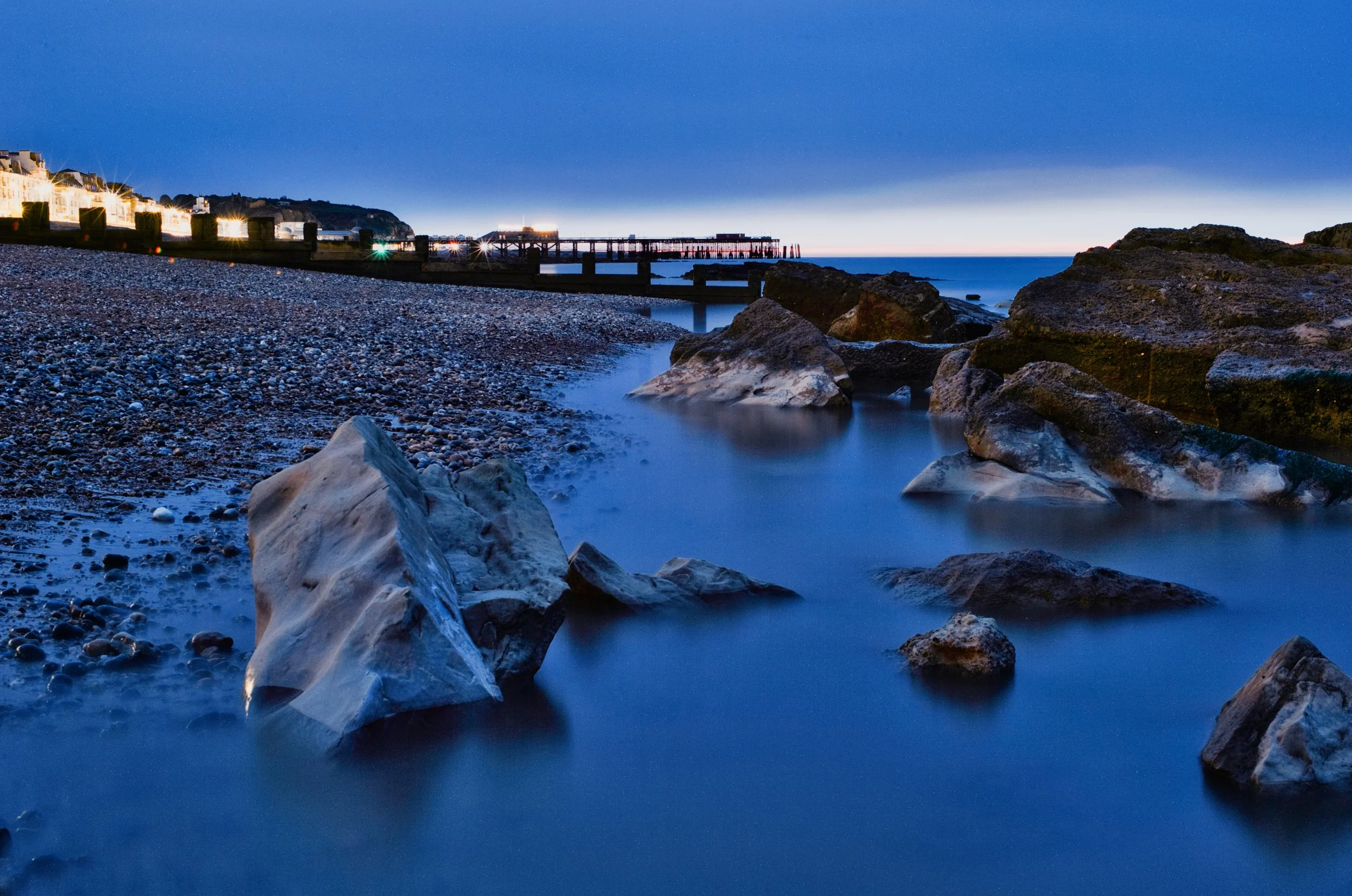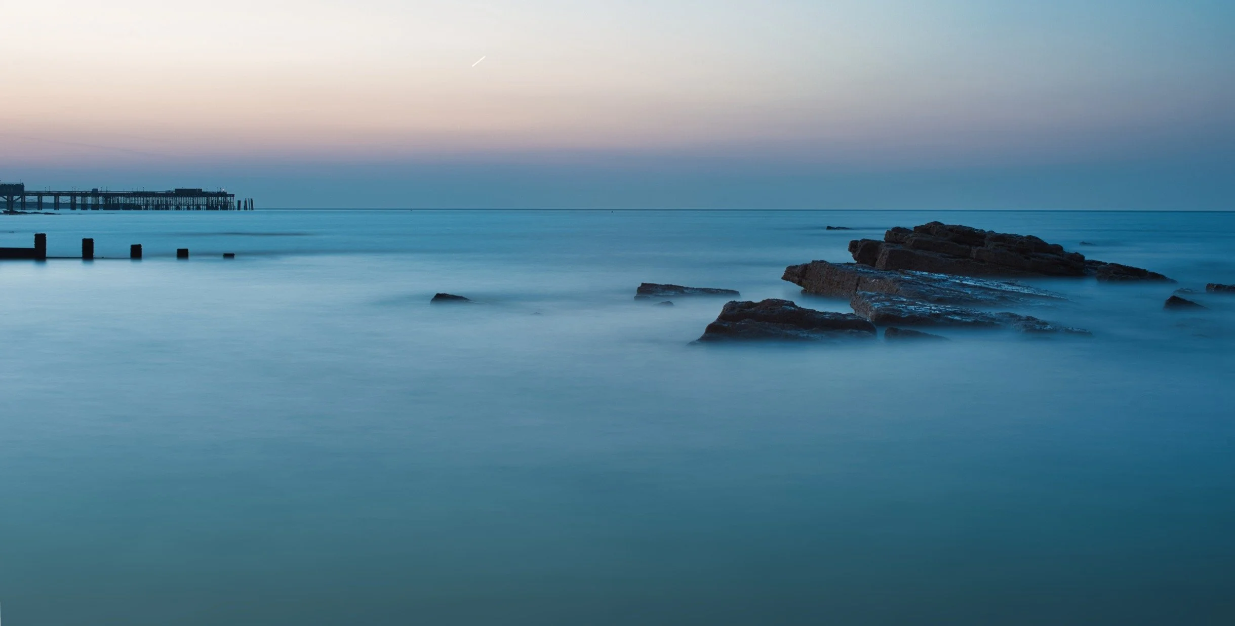An early dawn light breaks over the rocks at St Leonards-on-Sea.