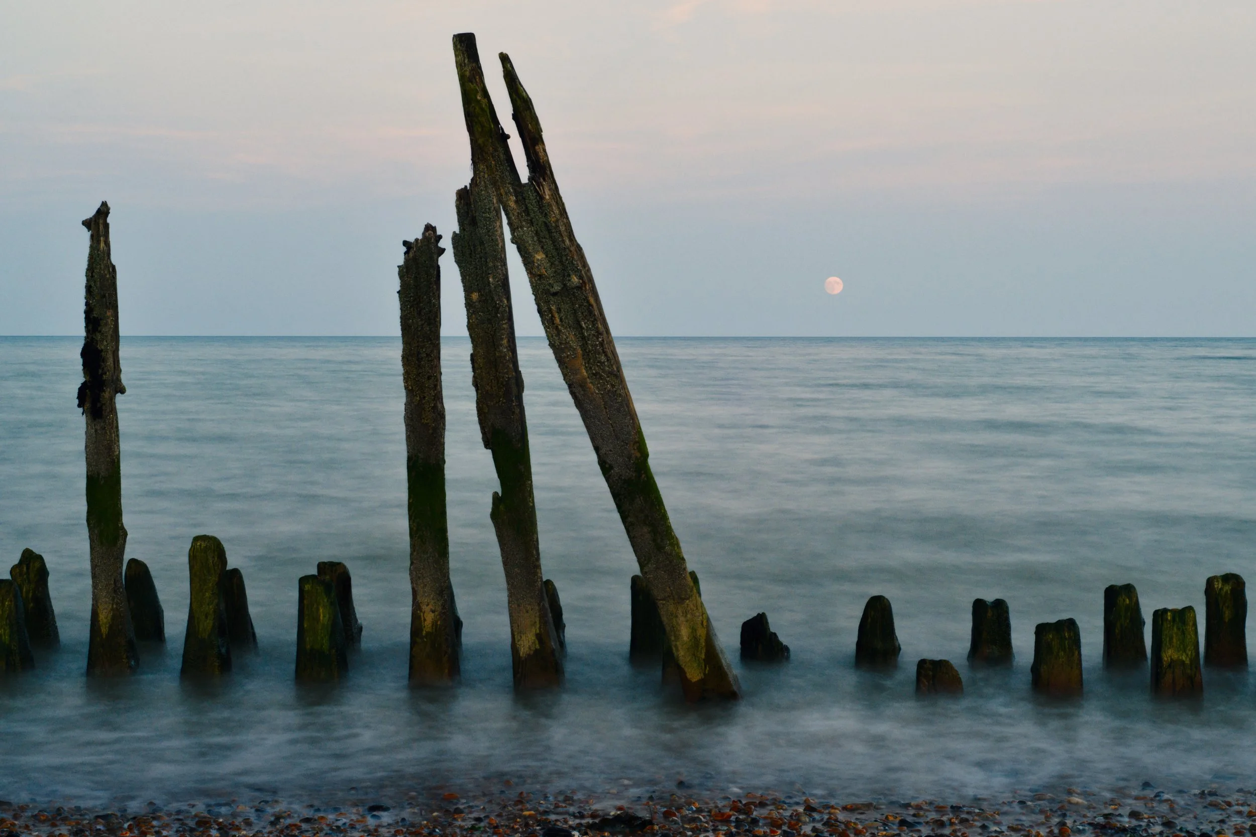 The setting moon cast a lovely warm glow over the rock and surf on this summer morning in St Leonards-on-Sea.