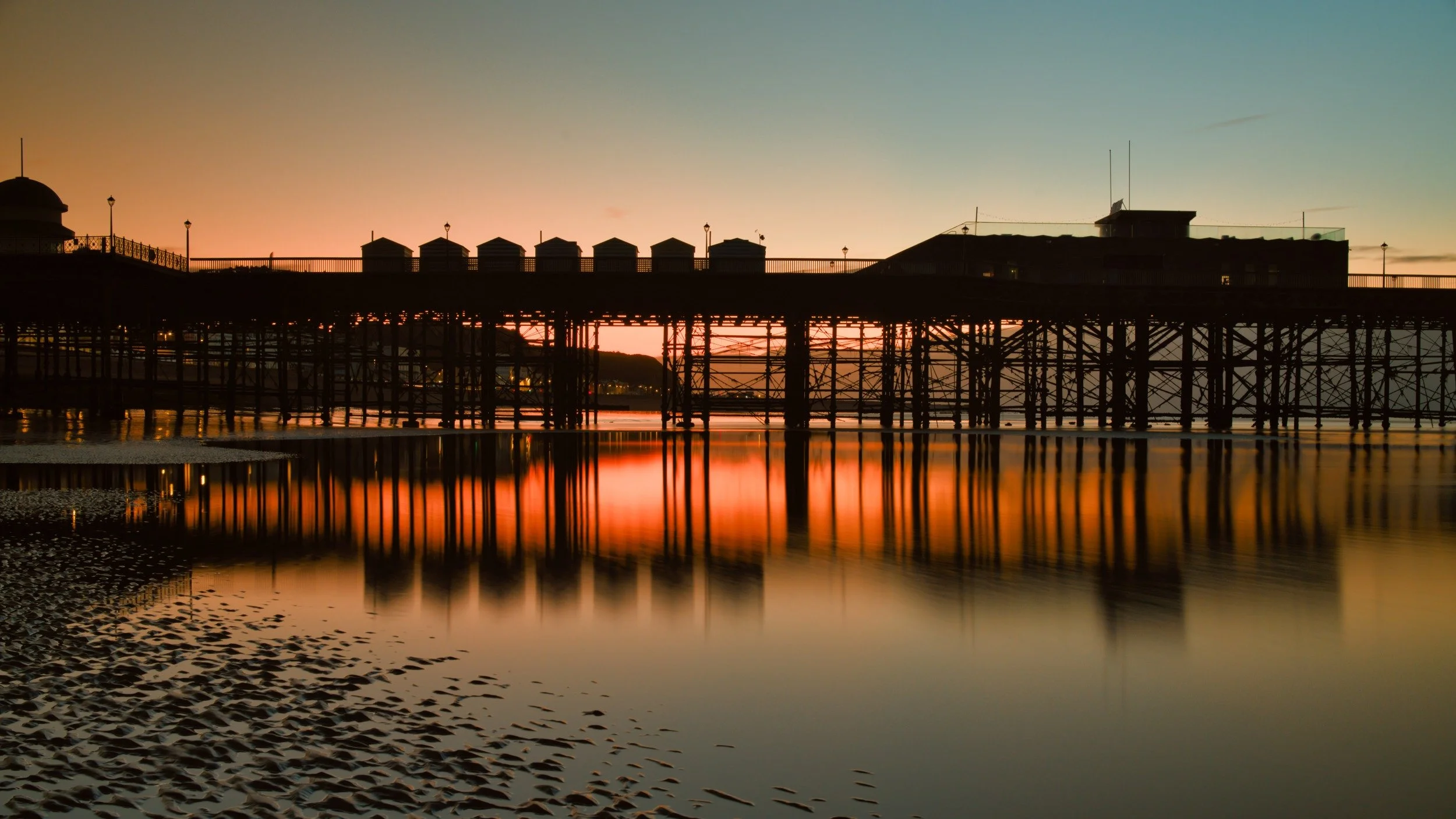 The glow of the rising sun is captured in the reflection of the pier. The gentle morning breeze creates fine ripples on the surface of this tidal pool, distorting the reflection.
